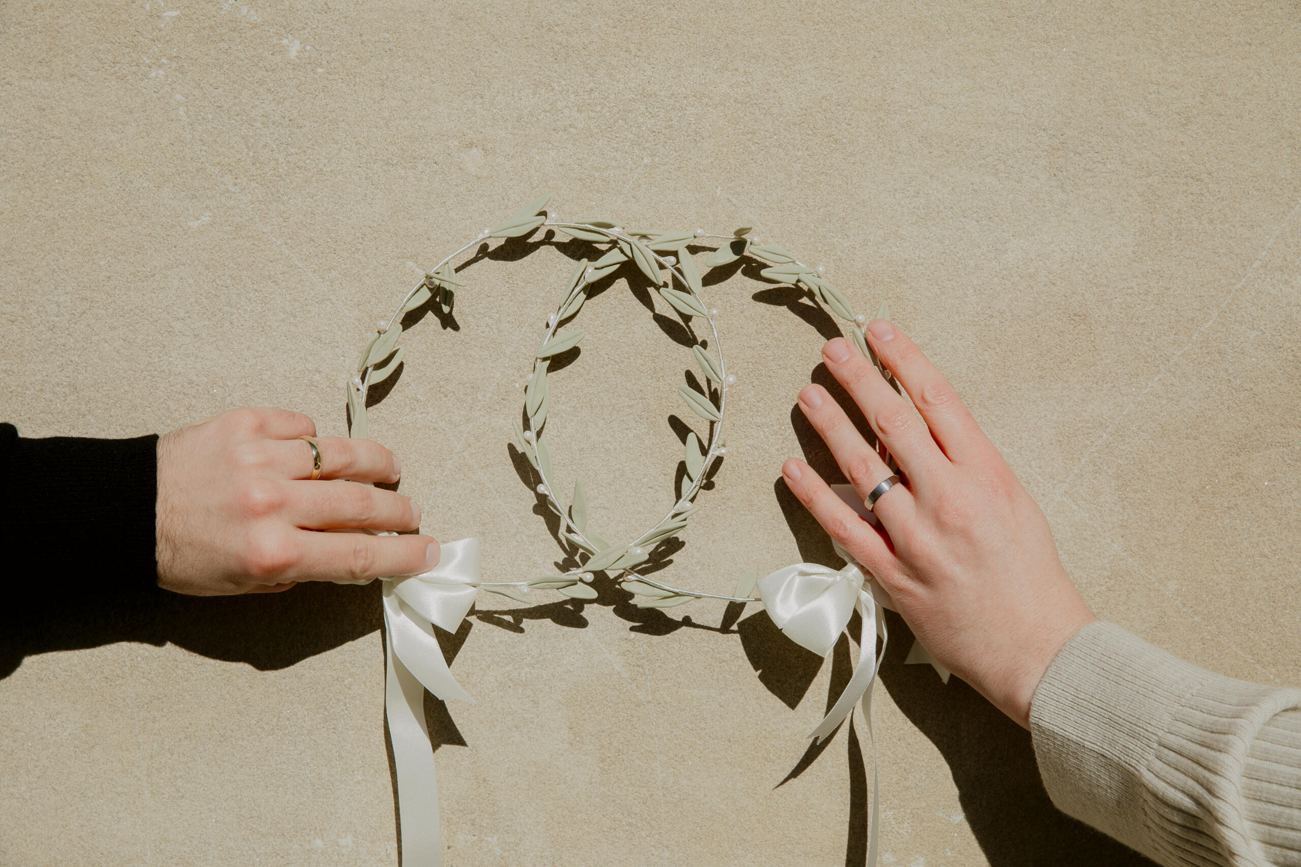 In Greek Orthodox weddings, Stefana (or wedding crowns) are two crowns joined by a ribbon, symbolizing the unity of the bride and groom groom and groom. The Koumbaro (best man, maid of honor, or in our case, photographer) exchanges the Stefana three times over the couple's heads during the ceremony, in a symbolic blessing.